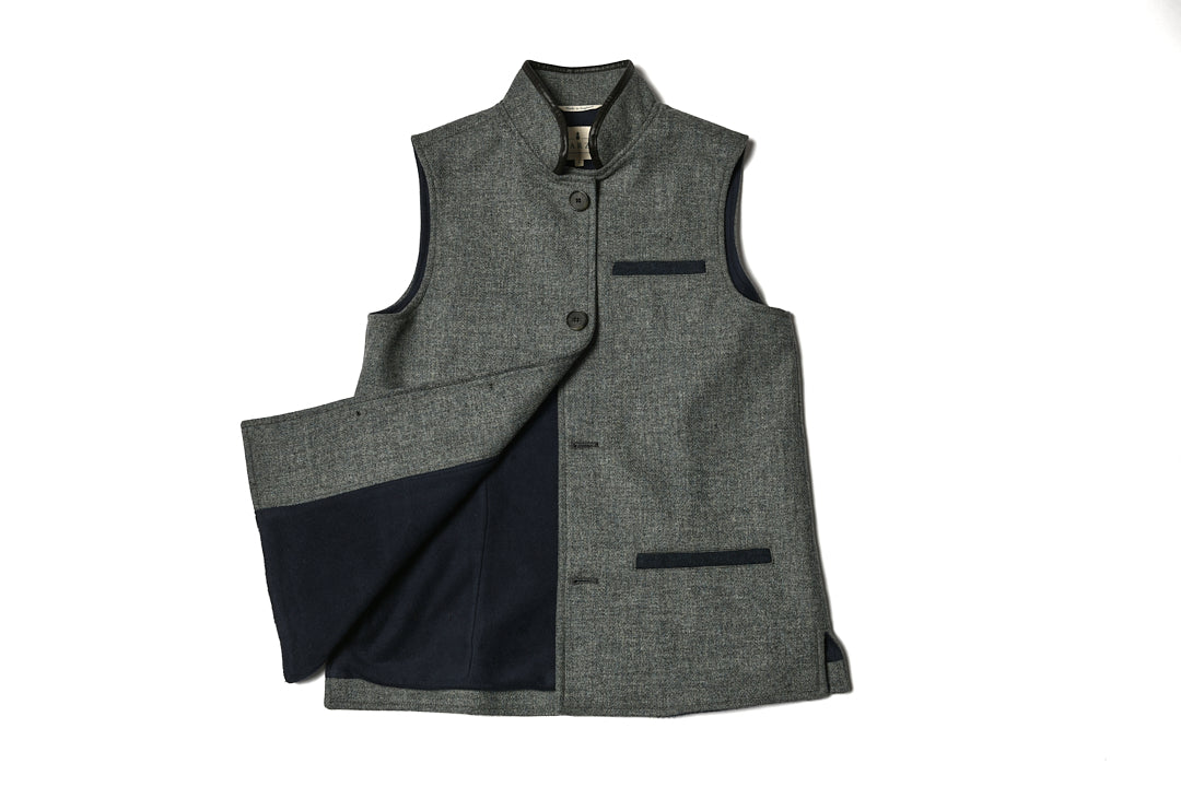 A product of the age old manufacturing traditions and skilled craftsmanship that can still be found at the heart of the Yorkshire textile industry, this 100% British wool and British made gilet features an unusual heathered tweed that has been exclusively designed, woven and finished for us in the Colne Valley on the outskirts of Huddersfield, West Yorkshire.