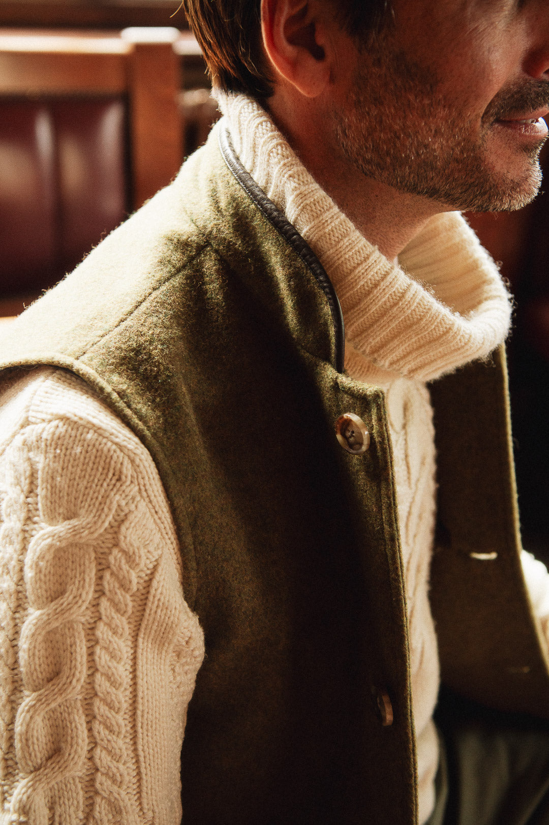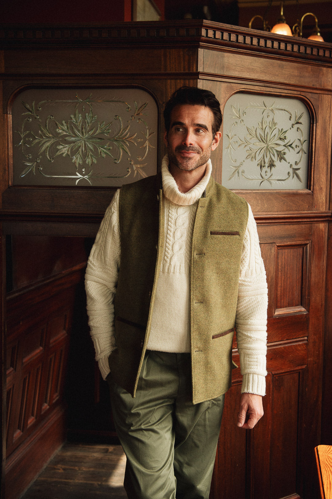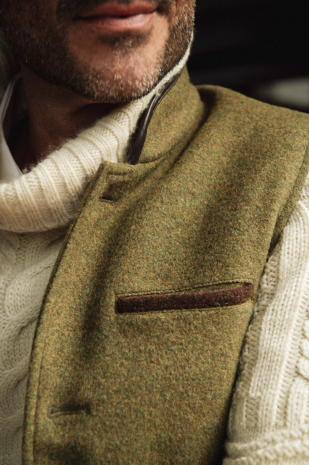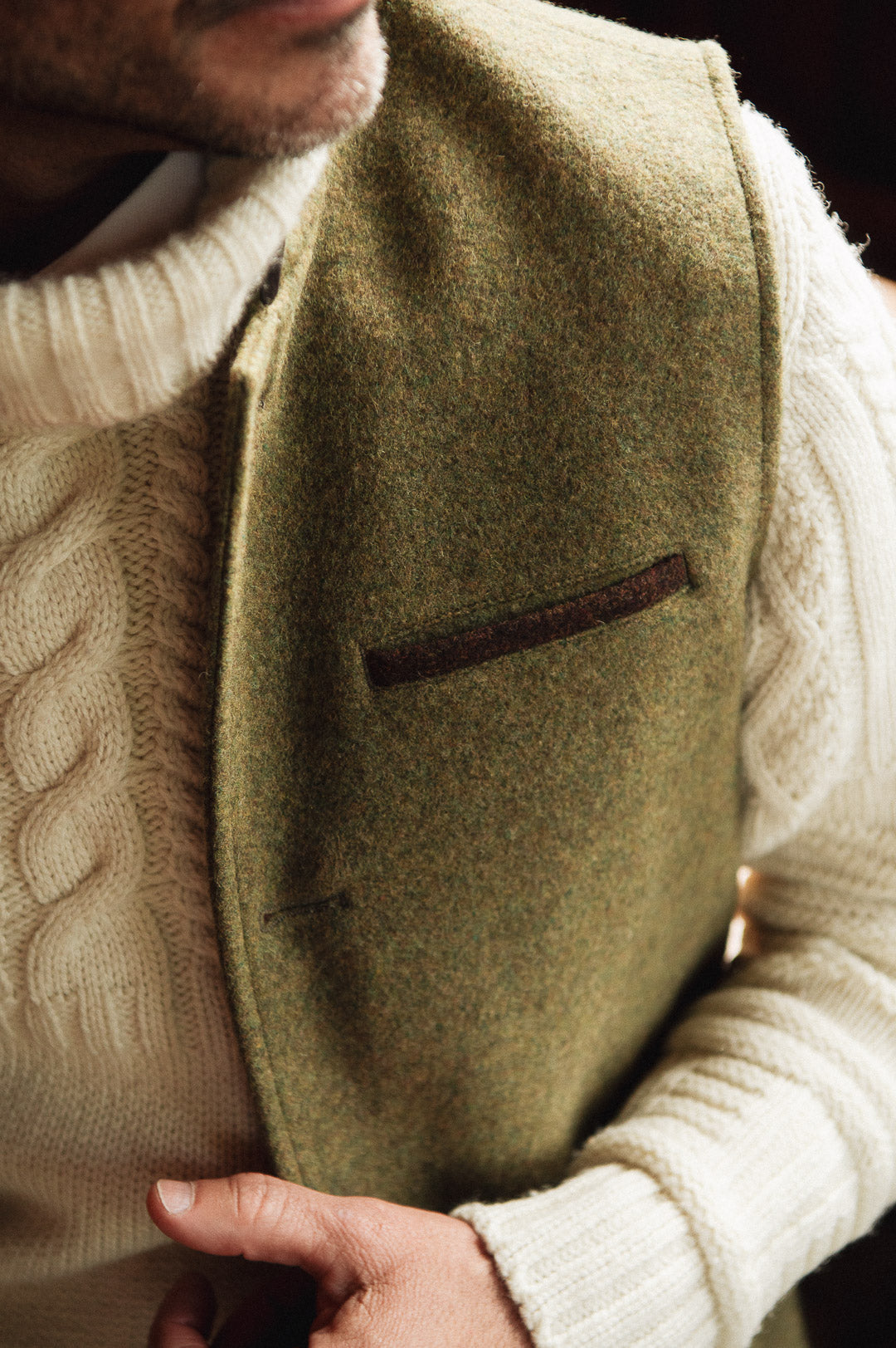 Warm, soft and yet hardwearing, this thick-cut merino wool waistcoat in pastoral Moss Green with contrasting brown pocket detailing feels as comfortable as it looks. Wearable over a t-shirt, shirt or jumper, or even under a coat, think of it as a loyal companion for all but the warmest of weather conditions.