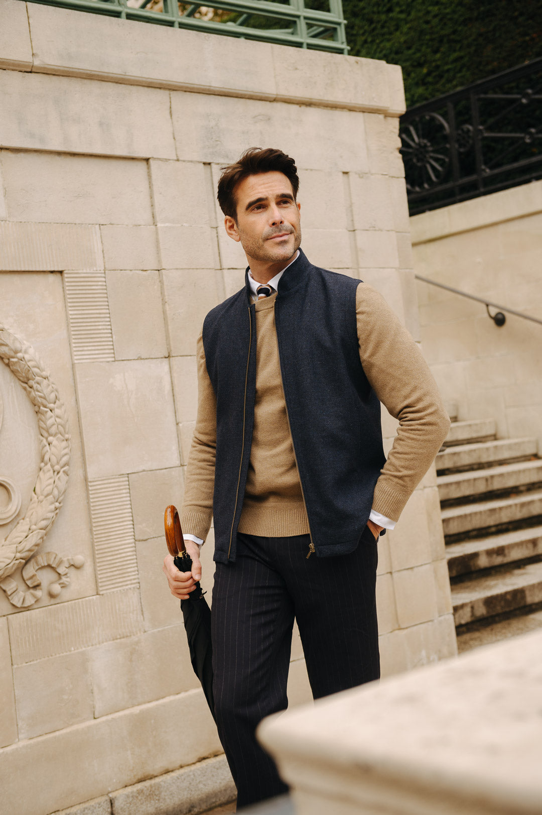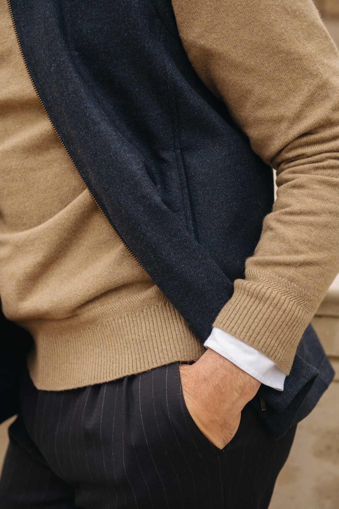 Featuring an aged brass zip closure, this particular style is crafted from a soft, lightweight Merino wool in a sleek dark navy tone overlaid with a subtle twill finish. Perfect for both professional and casual settings alike, it can be layered effortlessly over a shirt or under a jacket for a polished everyday look.