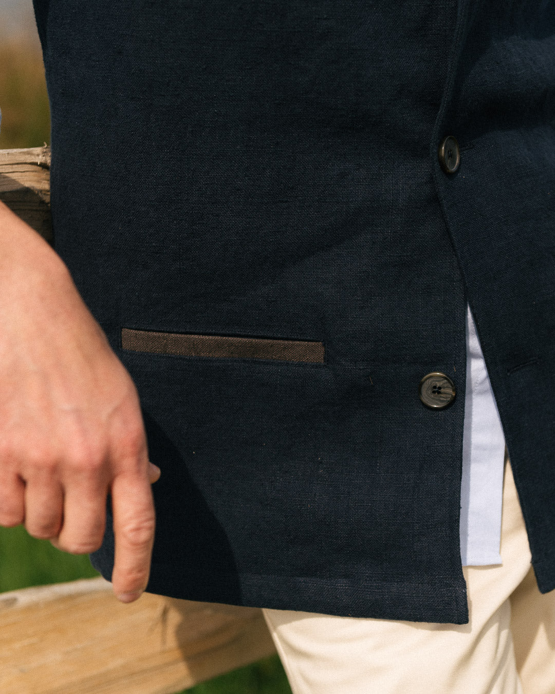 Quarter lined and cut from a 400g/sm top grade Belgian linen, it has a durable, rugged and reassuringly weighty feel to it. This ensures that it holds its shape better than lighter weight linens and the natural temperature regulating properties of the fabric (linen is made from the Flax plant which has a hollow fibre) make it the perfect accompaniment for warm summer days and cooler evenings alike.