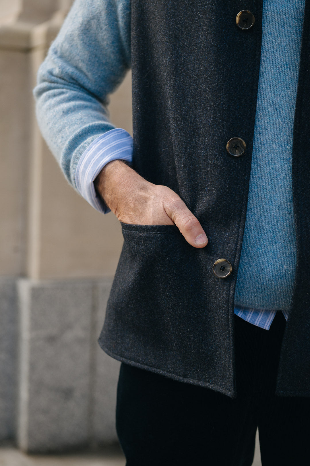 Available in Dark Navy and sumptuous Sage Green, it's a smart choice for anyone looking for a traditional, timeless extra layer, wearable indoors and out, under or over.