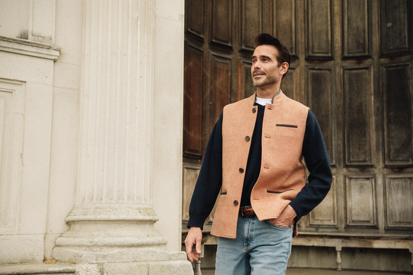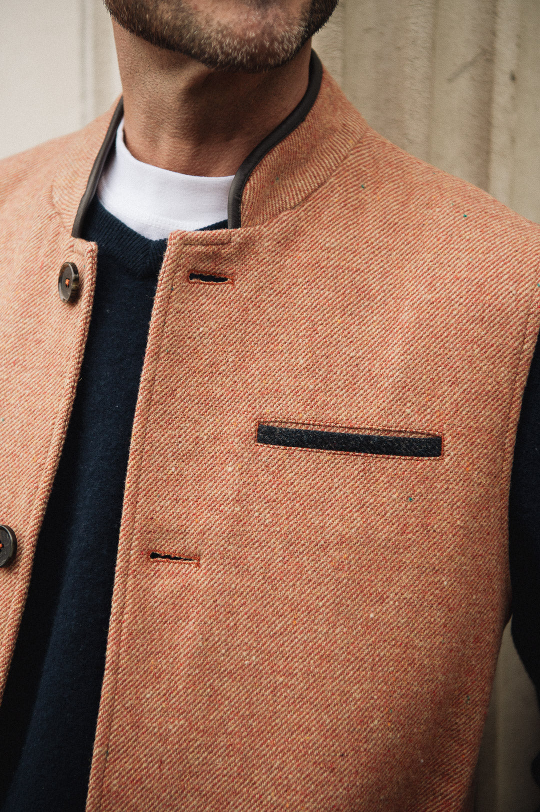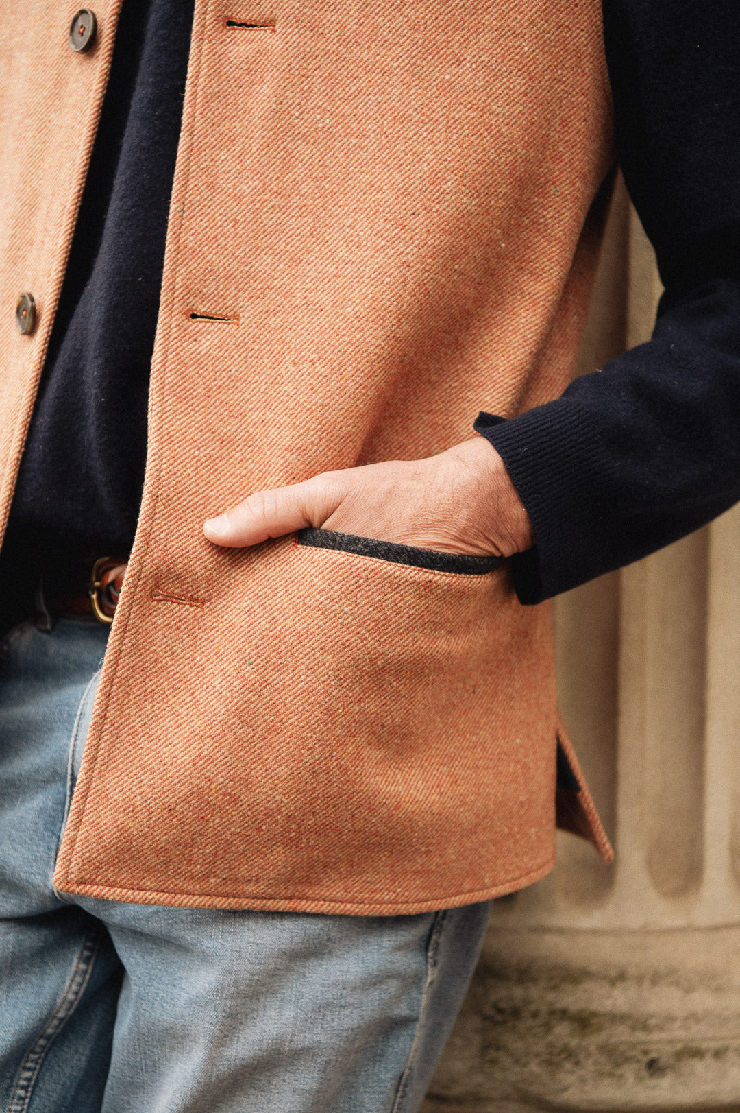 Cut from a hardy mid-weight lambswool twill and featuring navy contrast pocket welts, as with all of our Helmsley gilet styles it has been paired with a super soft navy organic cotton fleece lining and features two inner chest pockets, an outer breast pocket and two side pockets for keeping hands warms. A traditional stand collar trimmed with premium Italian leather binding completes the look.