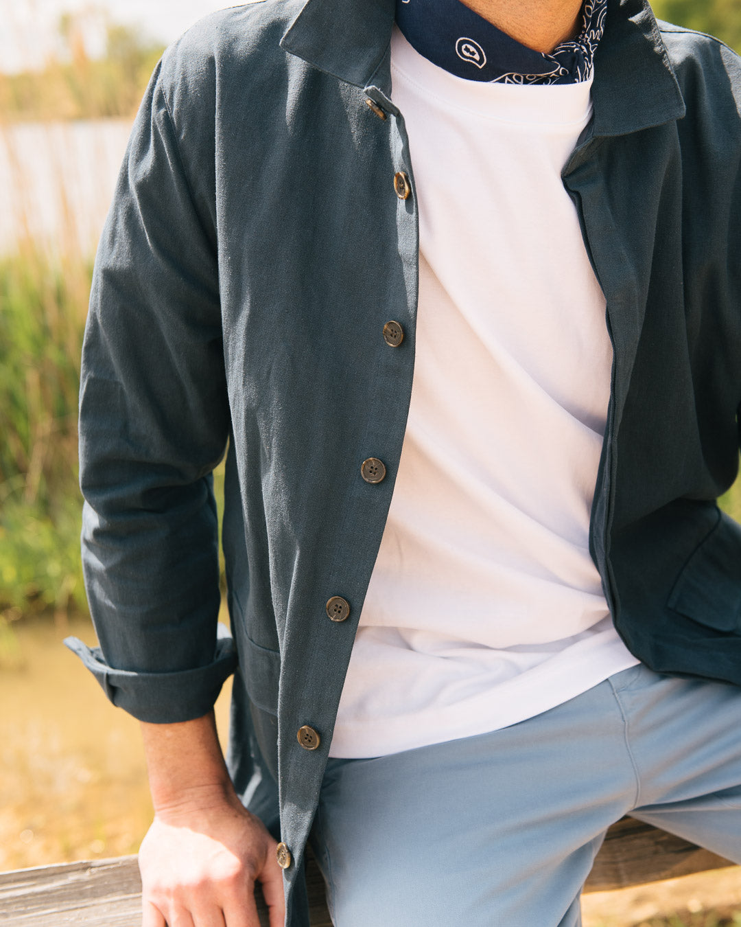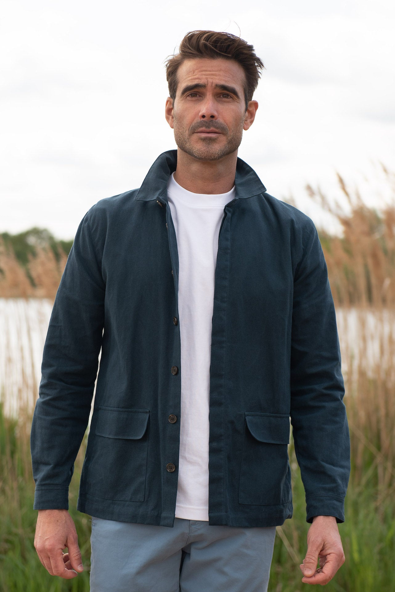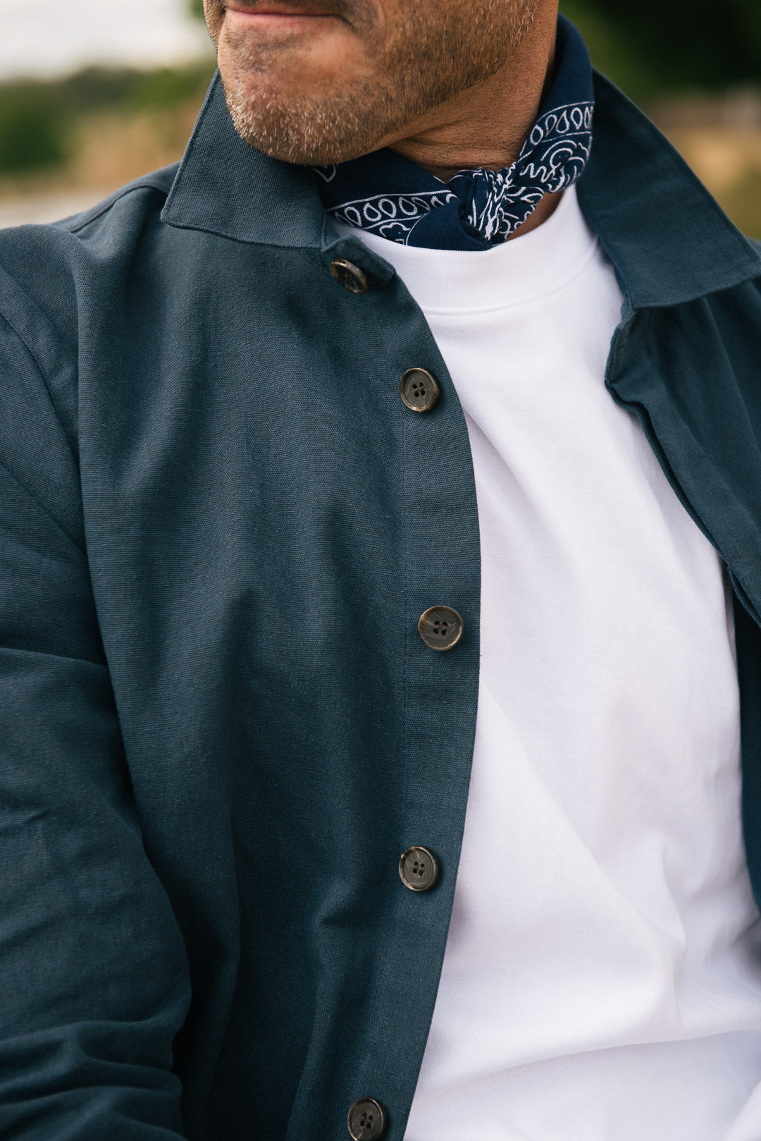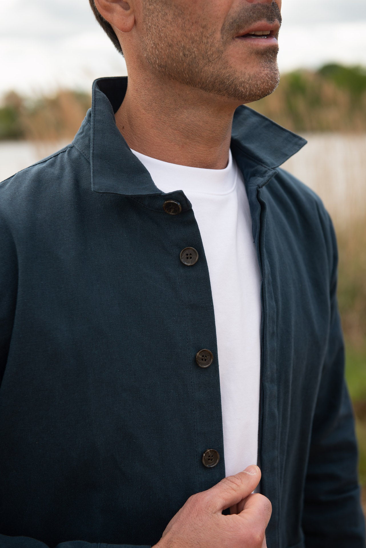 Unstructured and unlined, with this interpretation we have opted for a deliberately paired back design constructed from a durable, shower proof blend of dry waxed cotton and linen in a deep petrol blue. Come shower or shine, simply throw on for a confidently casual extra layer.